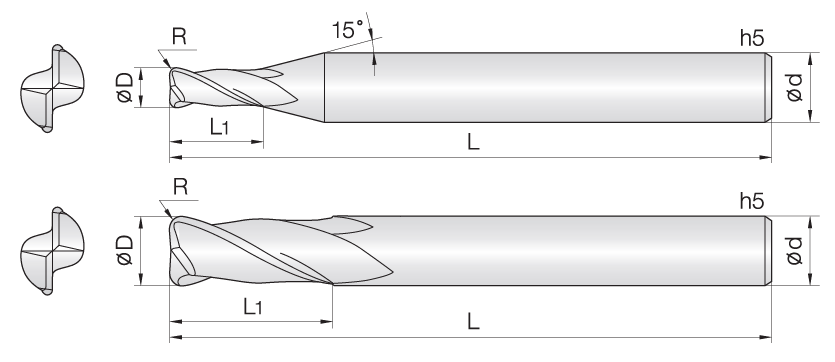 Фреза конечная с угловым радиусом закругления 2NCRG0040005S04 (0.4xR0.05x0.8x45LxS4x2F)