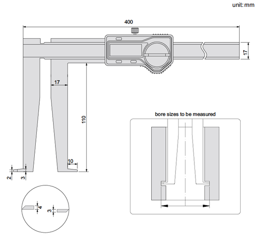 Для измерения диаметра канавок внутри отверстий. Разрешение: 0,01 мм/0,0005 дюйма. Автоматическое включение/выключение питания. Кнопки: вкл/выкл, ноль, мм/дюйм. Вывод данных (код кабеля: 100-11 или 100-12). Изготовлен из нержавеющей стали.