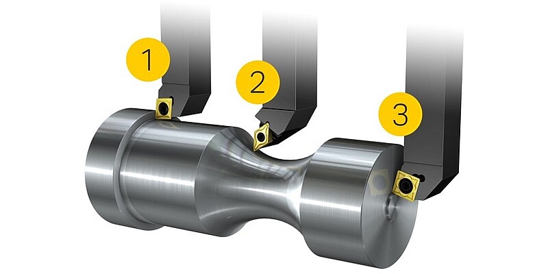 Базовыми областями применения для наружного точения являются продольное точение (1), профильное точение (2) и подрезка торца (3).